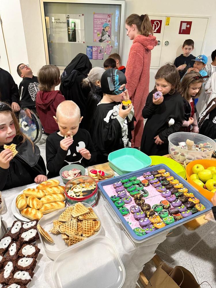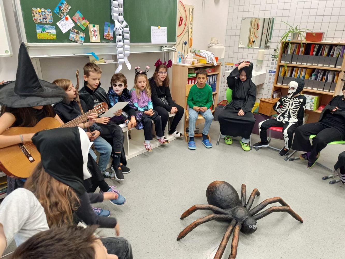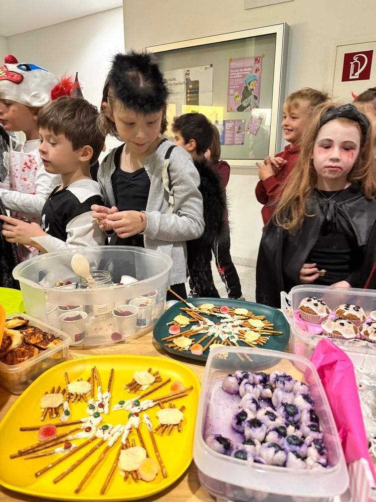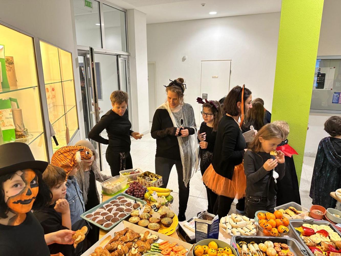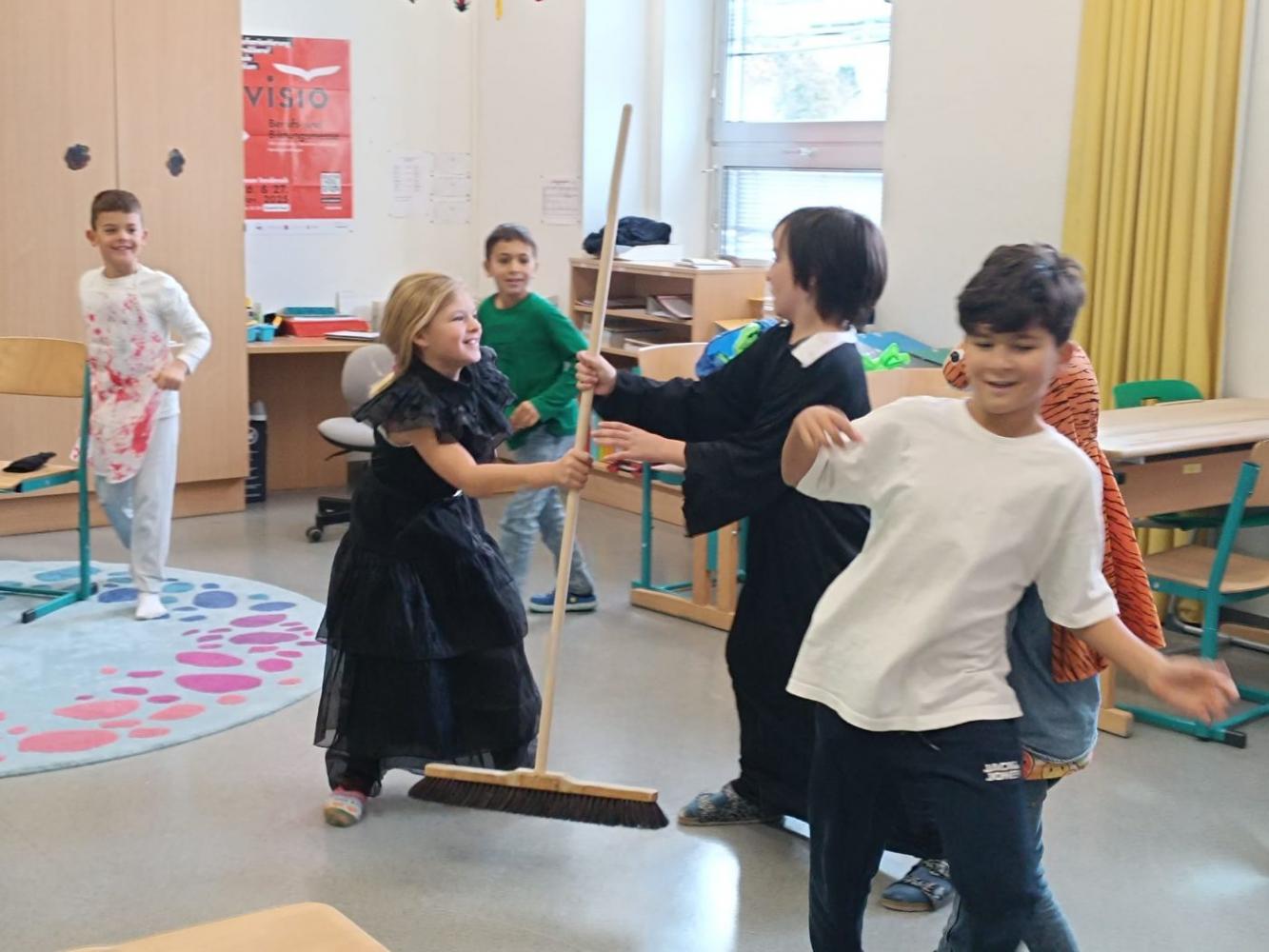 Am Freitag, den 24. Oktober trieben sich äußerst gruselige Figuren im 2. Stock herum. Alle Klassen im 2. Stock öffneten für das Gruselkabinett die Türen. Die Gestalten durften in Gruppen die Stationen besuchen. Dabei waren eine Gruselgeschichte, eine Schminkstation, ein Hexentanz, eine Geschichte für alle Sinne, eine Boomwhacker-Liedbegleitung, eine Bastelecke, Stationen im Turnsaal und ein tolles, schauriges Halloween-Buffet. Nach dem Fest starteten alle in die verdienten Herbstferien.